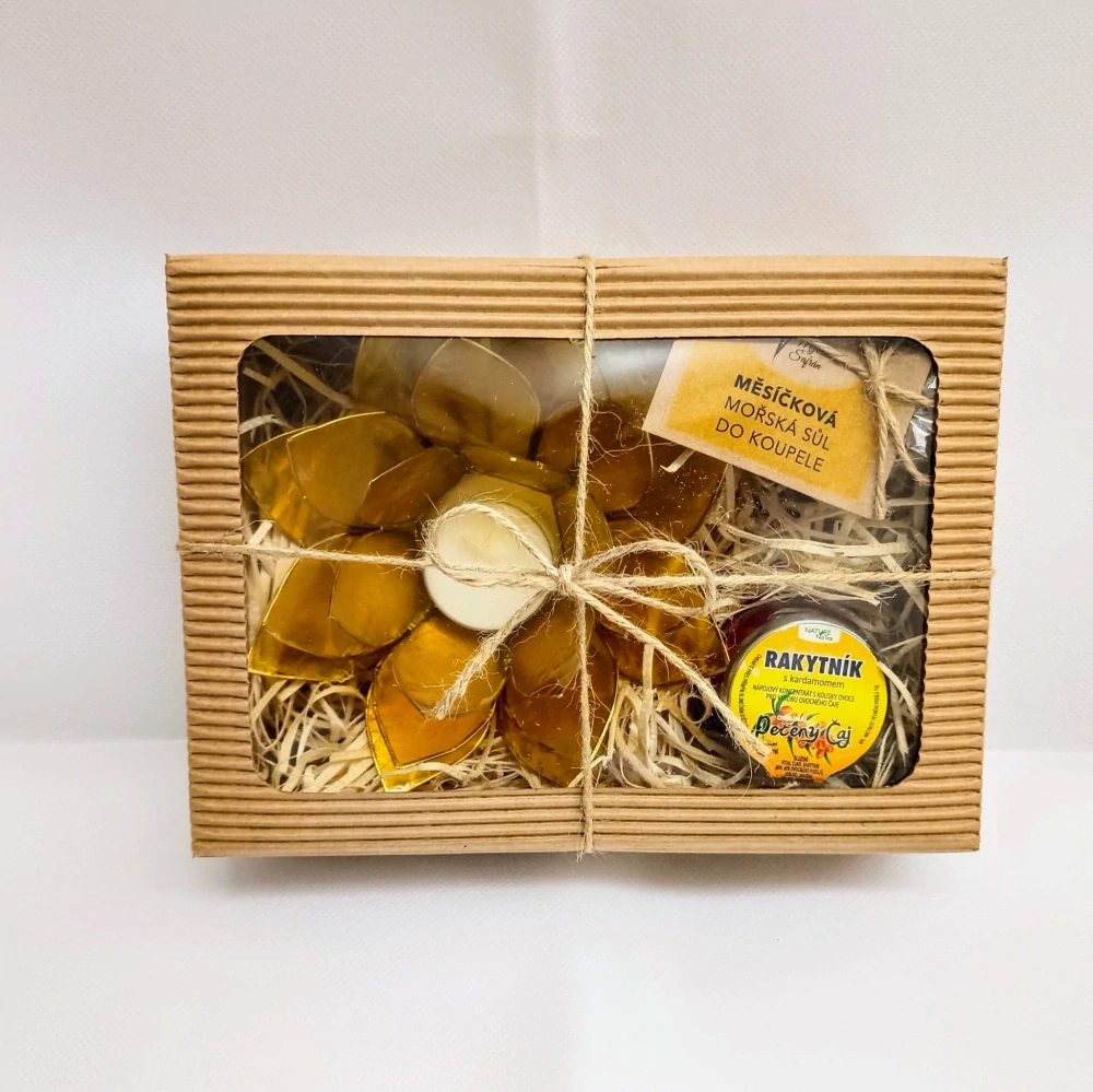 - Voňavou relaxaci:Měsíčkovou mořskou sůl do koupele, která uvolní tělo i mysl. (150 g balení v celofánovém sáčku)