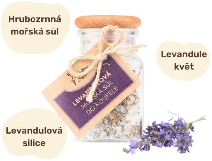 Relaxační aromaterapeutická koupel s mořskou solí s levandulovou silicí a květy levandule. Dopřejte si odpočinek a regeneraci při relaxační koupeli.