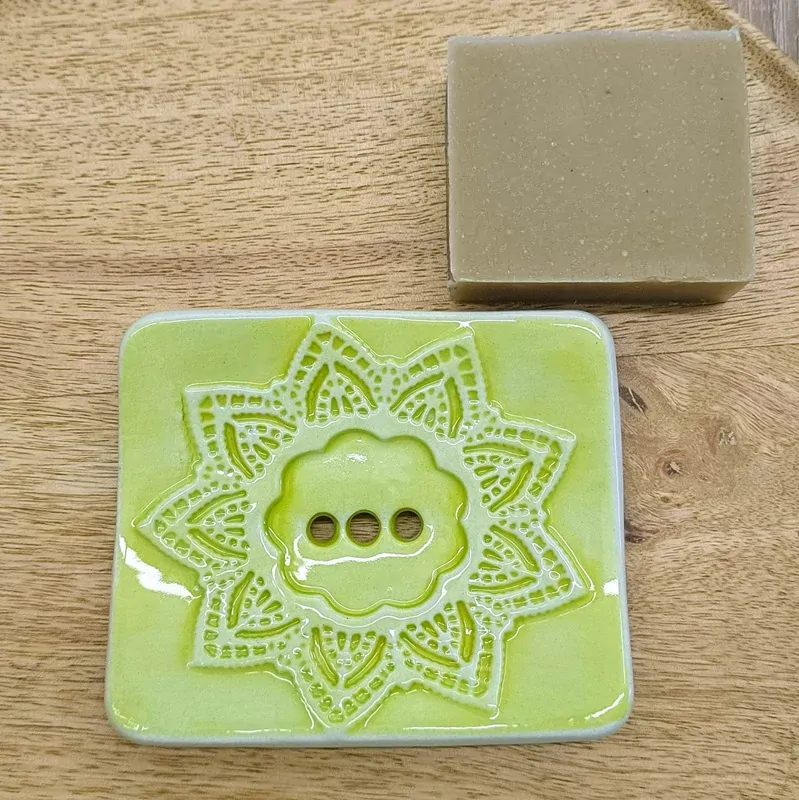 Ručně vyráběná keramická mýdlenka s kvalitní bílou a zelenou glazurou a reliefem mandaly. Mýdlenka má 3 dírky a 4 nožičky pro snadný odtok vody.
